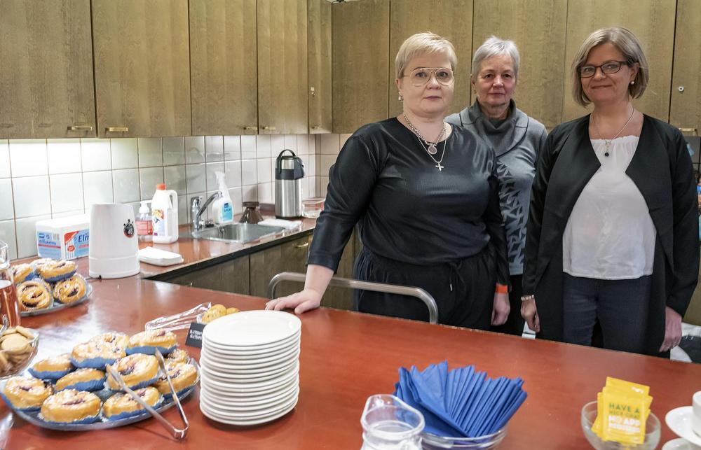 Kutsuvieraiden ja talkooväen kahvituksesta vastasivat MNL Pirkanmaan Piirin jäsenet vasemmalta Johanna Ahlgren-Holappa Messukylästä ja Sanna Myllymäki ja Marjo-Riitta Pirhonen Hämeenkyrön yhdistyksestä.